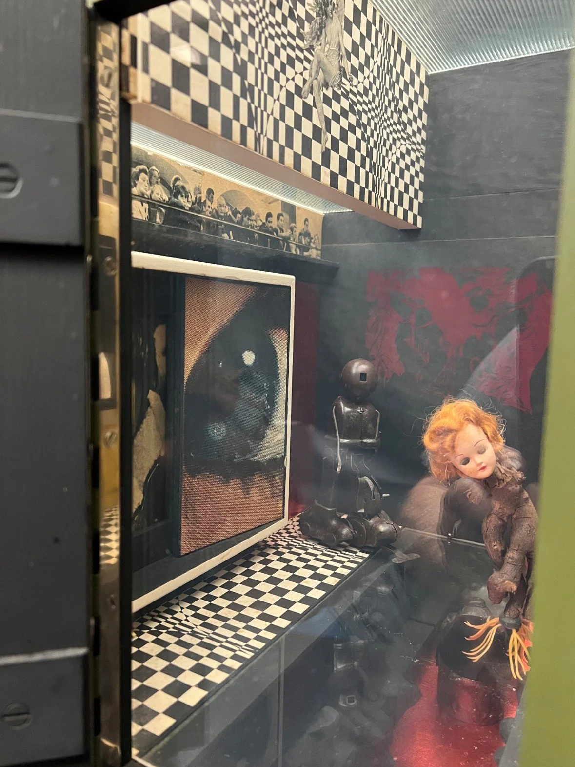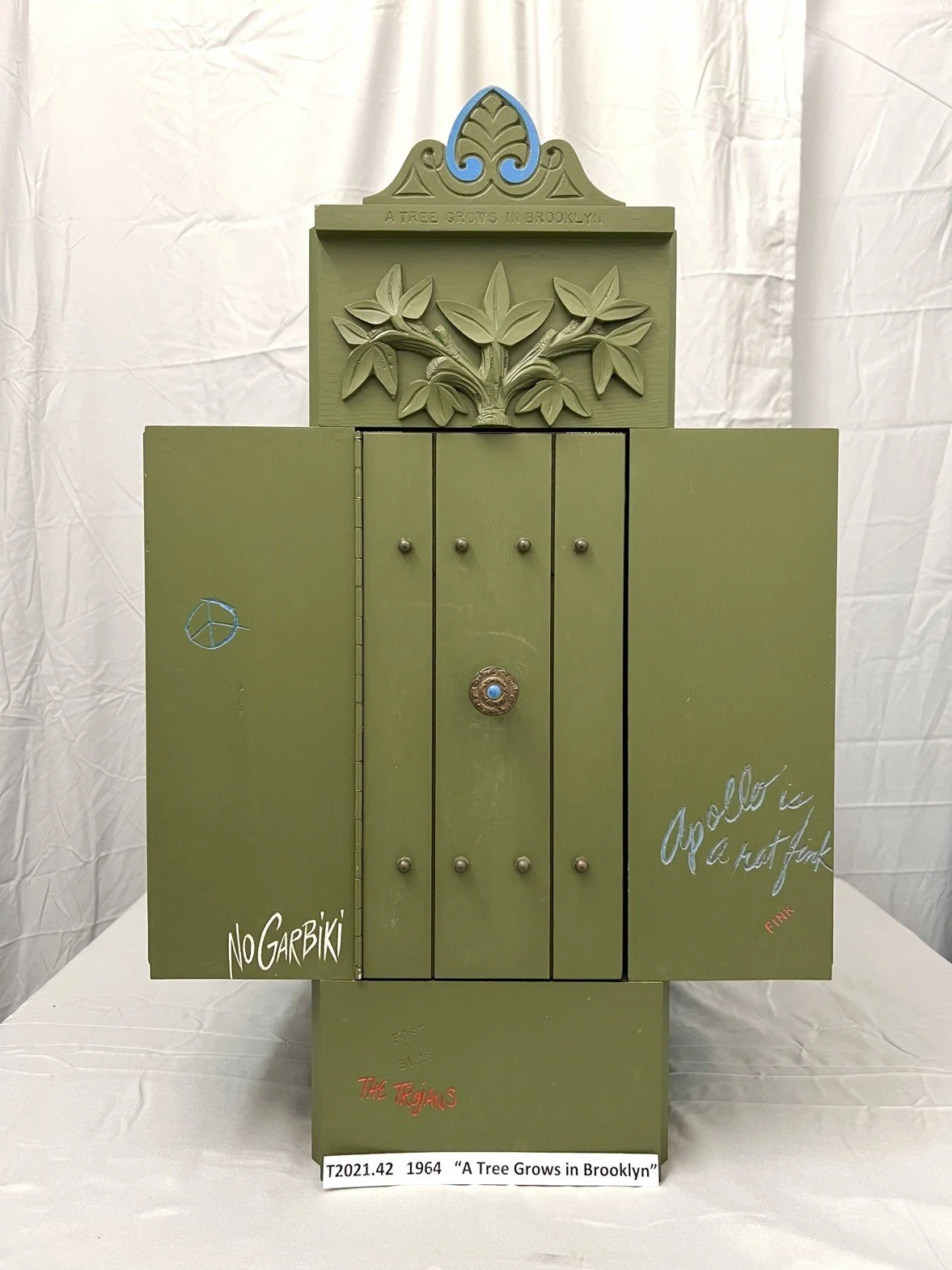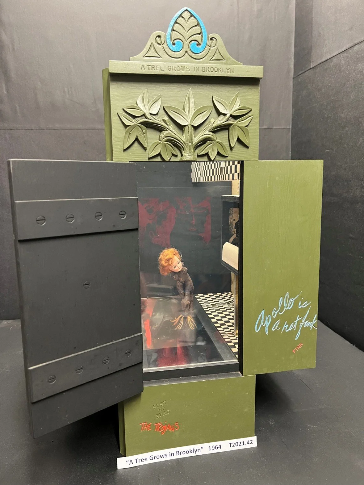This reliquary was constructed near the end of Nichelson’s cathedral series and is still an assemblage but with greater elaboration in exterior finishes and interior design. Based on the 1965 murder of Kitty Genovese in Brooklyn, the title comes from the 1943 book by Betty Smith, but here it is adapted to the Greek myth about Daphne who escaped the pursuit of Apollo by turning into a tree.